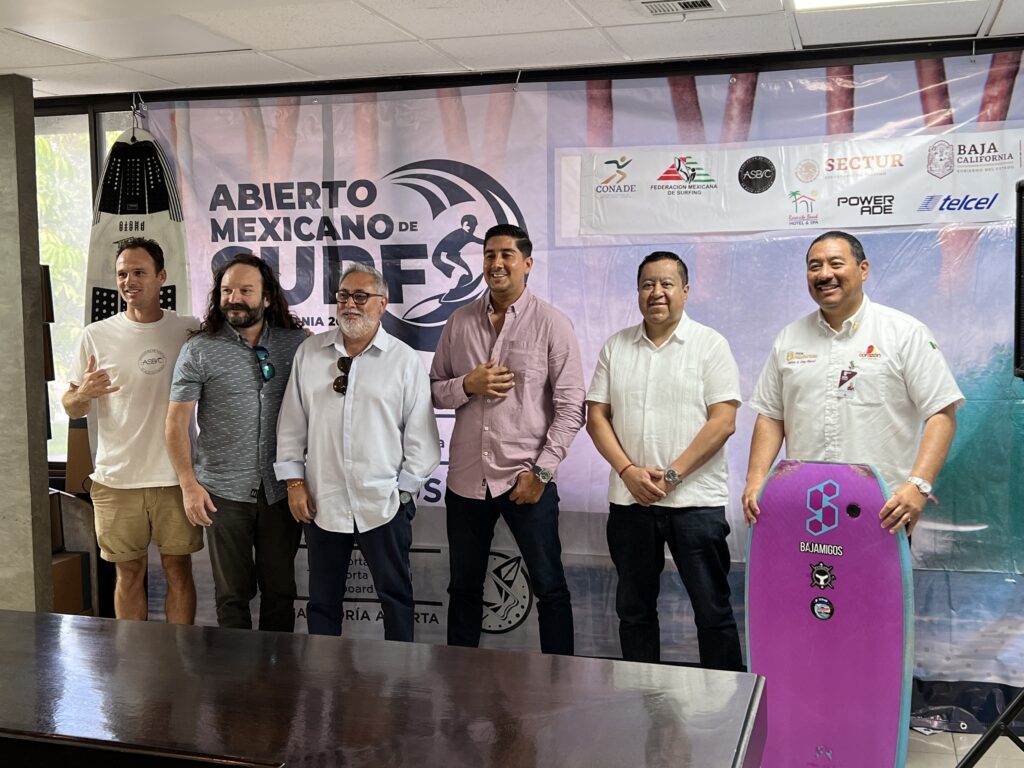 En la conferencia también estuvieron César Rivera González, presidente del Cotuco Rosarito; Carlos Valenzuela Dávalos, delegado metropolitano de la Secretaría de Turismo de BC; José Sariñana Ordorica, secretario de la Asociación de Surfing de BC; Carlos Eliazib King Ristori; director de alto nivel de competencia del Instituto del Deporte y la Cultura Física de BC.