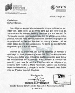 Méndez se dirigió directamente al Sr. Internet, a John Twitter y a Marc Facebook, y aseguró que “basta de que estén publicando cosas que no son en sus portales y paginas de internet web (sic). Esta carta es la primera y última advertencia que el gobierno nacional y plenipotenciario de Nicolás Maduro les hace. Hacemos un llamado a su reflexión, señor Internet”.