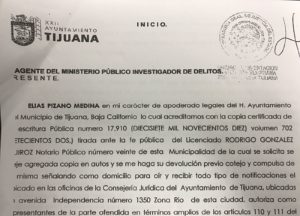 Tijuana, BC a 01 de febrero de 2017.- La Tesorería Municipal del XII Ayuntamiento de Tijuana, presentó una denuncia penal ante la Fiscalía estatal, por los presuntos delitos de Peculado Impropio y Abuso de Confianza, contra el ex tesorero municipal José Manuel Noriega Moreno, el ex Recaudador Guillermo Llórenz Covarrubias y el ex director de Informática Jati Rodríguez.