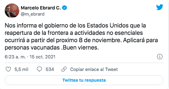 Por parte del Gobierno Mexicano, el secretario de Relaciones Exteriores, Marcelo Ebrard, también compartió la noticia a través de twitter haciéndolo de manera oficial.