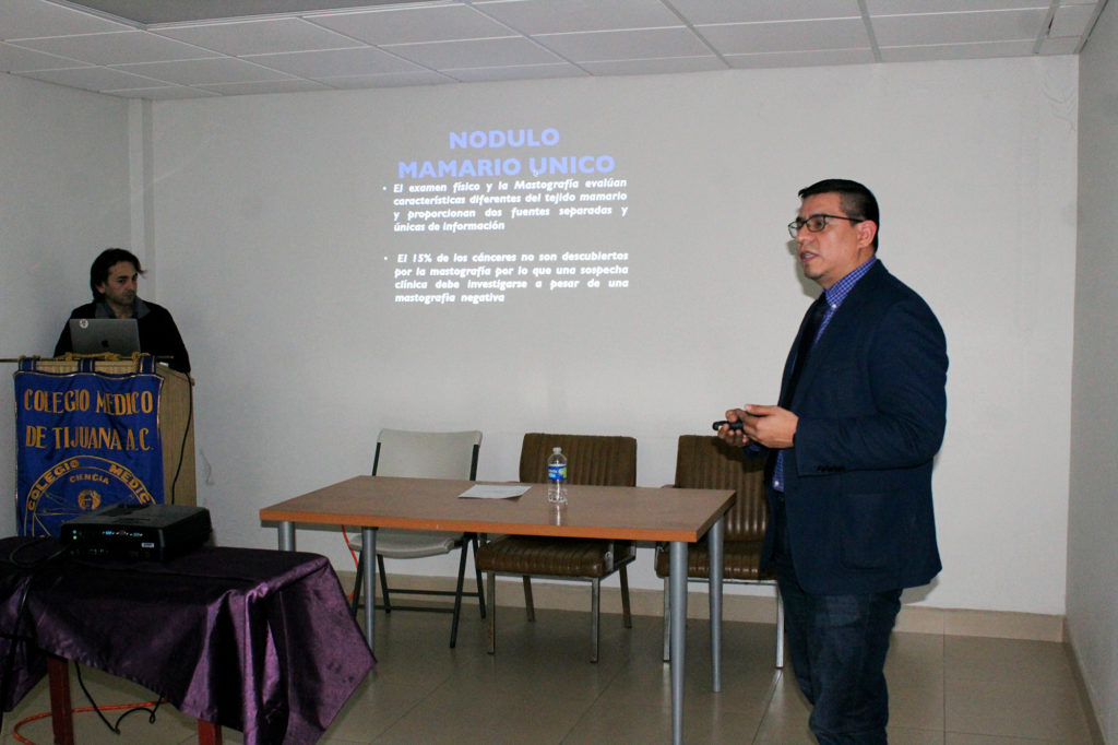 Durante una charla que ofreció en el Colegio Médico de Tijuana A.C., que preside el Dr. Abraham Sánchez Frehem, resaltó la importancia de la constante capacitación de los médicos acerca de la detección oportuna del cáncer de mama y la colaboración con otras especialidades médicas para brindar un manejo integral al paciente.