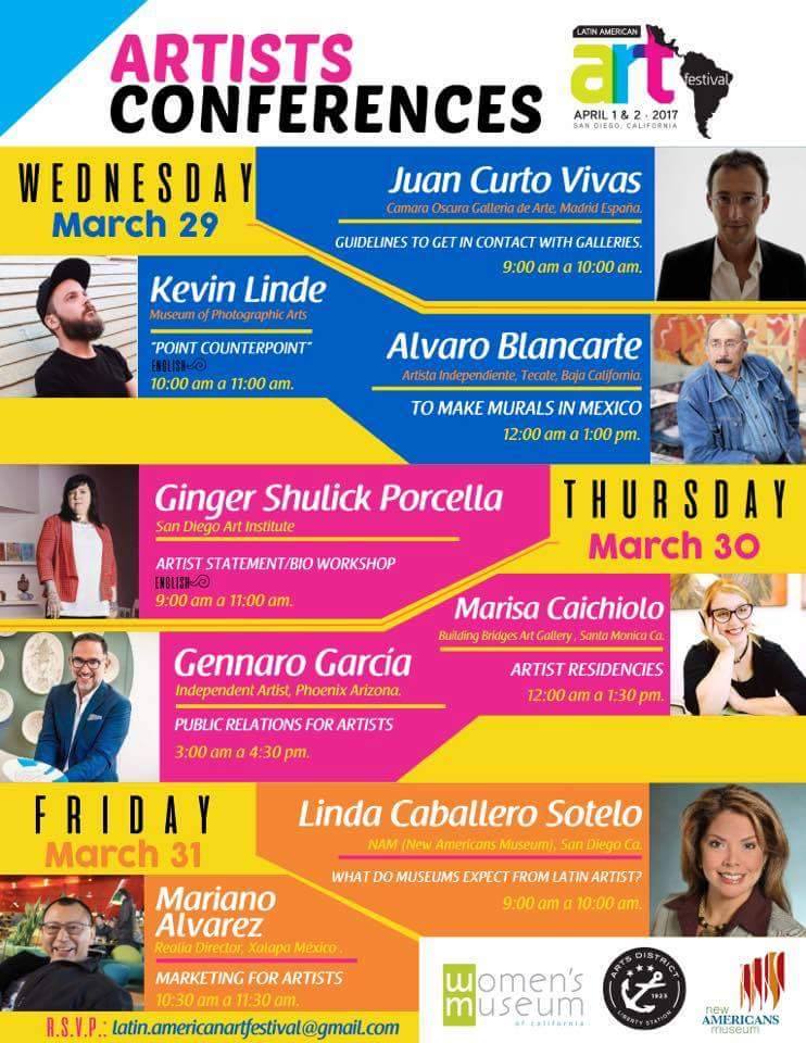 Sumando al festival, el Comité de Latin American Art Festival con el apoyo de Plantronics del 29-31 de marzo realizará un ciclo de 8 conferencias con el objetivo de ofrecer a los artistas la oportunidad de conocer cómo se maneja el mercado del arte anglosajón para facilitar el puente entre ellos y las posibles oportunidades. Las conferencias serán dirigidas por expertos en temas que van desde relaciones públicas, mercadotecnia para artistas, estrategias para acercamiento con galerías hasta lo que espera el museo de un artista latino. Las conferencias se llevarán a cabo en el Woman’s Museum y en el New Americans Museum.