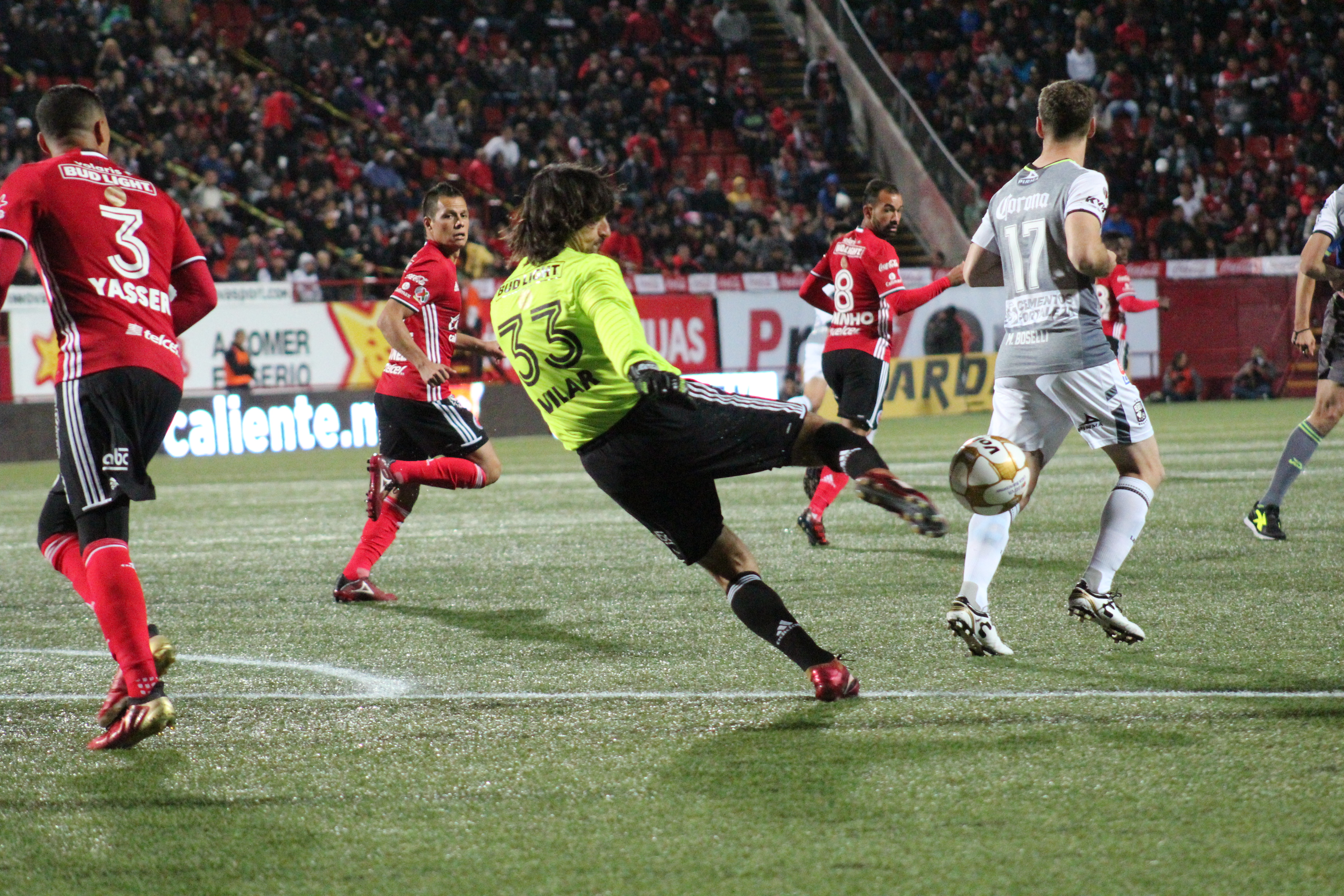 Por la visita pintó de amarillo a William Yarbrough y a Guillermo Burdisso. Alineaciones: Tijuana.- Federico Vilar, Juan Carlos Núñez, Juan Carlos Valenzuela, Emmanuel Aguilera, Yasser Corona, Damián Pérez, Guido Rodríguez, Vitor Gomes “Juninho”, Avilés Hurtado (Víctor Malcorra, 60), Dayro Moreno (Gabriel Hauche, 78) y Miltón Caraglio (Henry Martín, 70). DT Miguel Herrera. León.- William Yarbrough, Fernando Navarro, Diego Novaretti, Guillermo Burdisso (Juan Ignacio González, 46), Efraín Velarde, Leonel López (Maximiliano Moralez, 69), Alexander Mejía (Christian Valdez, 44), Elías Hernández, Luis Montes, Germán Cano y Mauro Boselli. DT Javier Torrente (ARG).