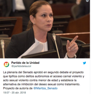 “La epidemia de violencia sexual que se cierne sobre nuestros niños, niñas y adolescentes requiere respuestas contundentes e inmediatas. Agradecemos el respaldo de los senadores y esperamos encontrar una respuesta igual en los representantes a la Cámara, quienes siempre han estado prestos a acoger nuestras iniciativas, tal y como sucedió con nuestra propuesta para que en el marco de la JEP, los delitos sexuales no tuvieran sanciones alternativas, sino penas máximas de prisión”, indicó la senadora Maritza Martínez, autora del proyecto.