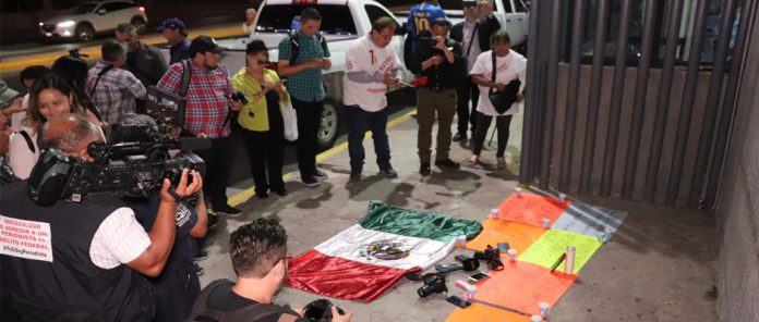 Presentes en la caminata, protesta y demanda de justicia acudieron con la bandera de México y pararon primero en la Secretaría de Seguridad Pública Municipal que encabeza Marco Sotomayor quien ha encabezado operativos de protección para compañeros de medios amenazados en esta ciudad para prevenir atentados.